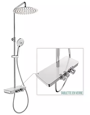 > COLONNE DE DOUCHE DOMAO 300 Mitigeur thermostatique corps froid Tablette en verre dépoli Tête Ø 250 mm orientable Douchette ABS 5 jets