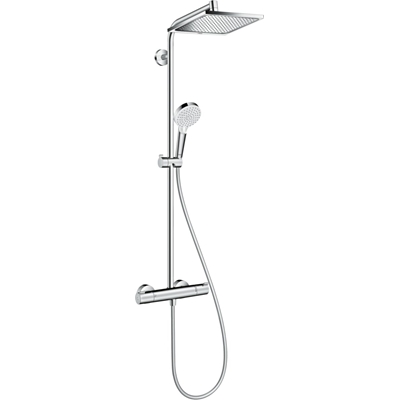 > COLONNE SHOWERPIPE CROMETTA Inclinaison coulissant peut être ajusté sur 45° Douche de tête Crometta E 240 - 1 jet Rain Dimension: 240 x 240 mm Longueur du bras de douche: 350 mm Douchette à main Vario EcoSmart En savoir plus »