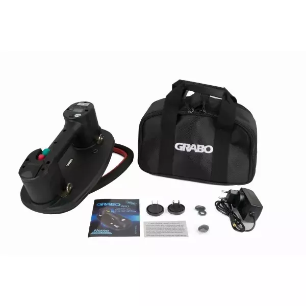 > GRABO VENTOUSE ÉLECTRIQUE PORTABLE Comprenant : 1 ventouse GRABO 1 house de transport 1 batterie 1 chargeur de batterie 1 joint mousse 1 jeu de filtre à air